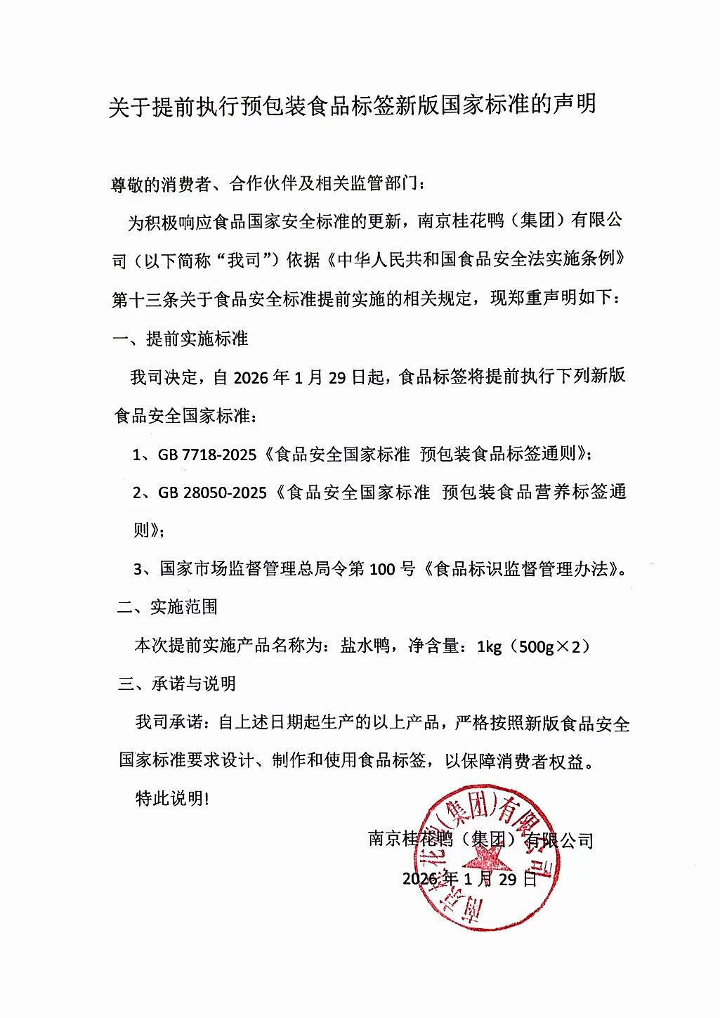 关于提前执行预包装食品标签新版国家标准的声明
