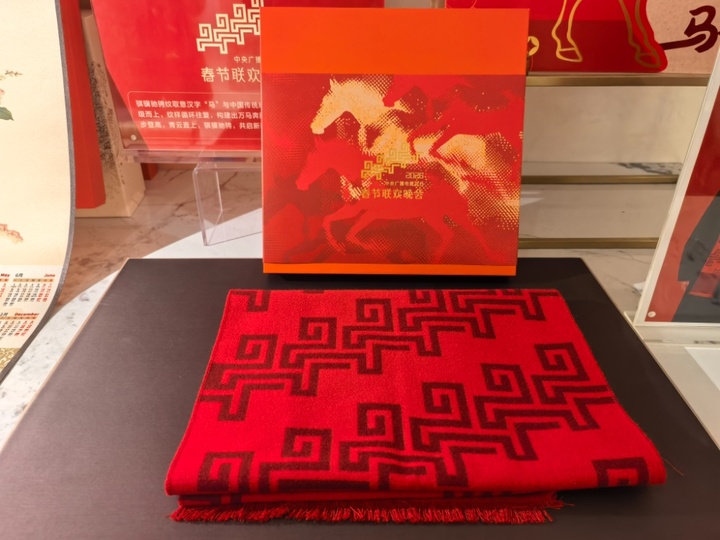 万事利丝绸和央视春晚联名的‘骐骥驰骋’红围巾。